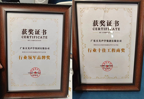 首屆“2023中國建筑聲學行業大評選”的頒獎現場群英薈萃,經過層層評選,最終天戈聲學榮獲十佳工程商、十佳聲學設計、領軍品牌獎項,從300多家參與品牌中脫穎而出。現場500+行業同仁齊聚一堂,共同見證這神圣的一刻。