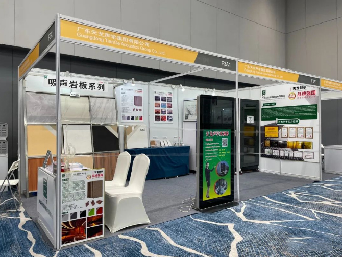 來自佛山本土品牌—天戈聲學,帶來了槽孔吸聲板、吸聲軟包類、空間吸聲體類、槽鋁吸音板、紅色玻鎂吸音板、陶晶砂吸聲板、高纖吸聲板、WGF不燃吸聲板、WCP吸音板,隔音板、隔音門,環保A級不燃吸隔聲產品等行業展品參展。