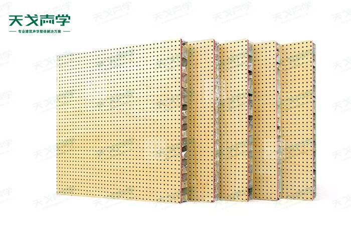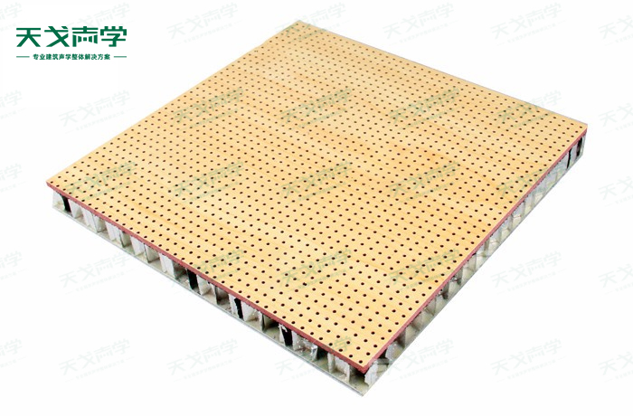 天戈鋁蜂窩復合孔木吸音板飾面顏色及材料選擇性廣,孔徑、孔距可根據客戶要求調整,能很好地滿足客戶多樣化的聲學及裝飾需求。孔木吸音板對吸聲頻譜選擇性較強,對中低頻有很好的吸聲性能。如在吸聲結構后空腔上填入適量的吸聲棉可提高中、高頻吸聲效果。