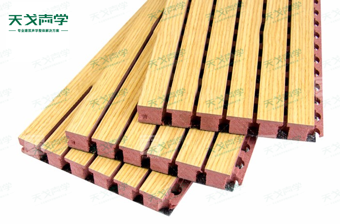 天戈防火槽木吸音板是一種在密度板的正面開槽、背面穿孔的狹縫共振吸音材料。防火槽木吸音板對吸聲頻譜選擇性很強(qiáng),對中低頻有很好的吸聲性能。若在吸聲結(jié)構(gòu)后空腔填入適量的吸聲棉可提高中、高頻吸聲效果,標(biāo)準(zhǔn)化模塊設(shè)計(jì),采用插槽、龍骨結(jié)構(gòu),安裝簡易,常用于墻面或天花裝飾。