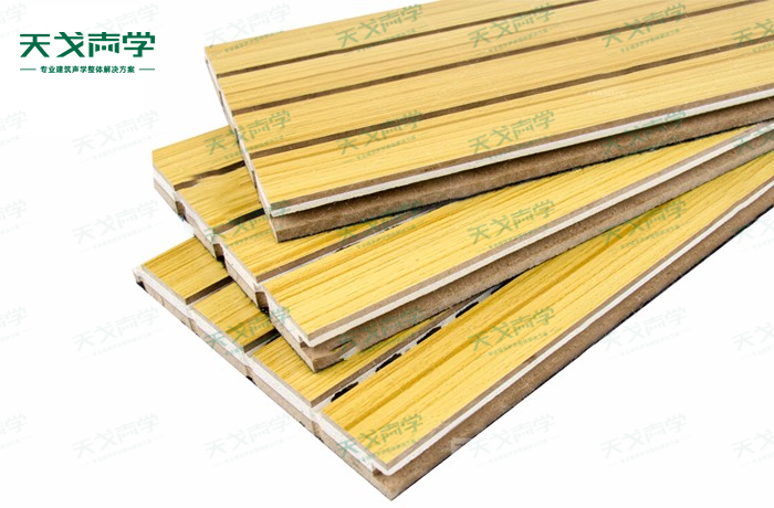 天戈復合槽木吸音板是一種在密度板的正面開槽、背面穿孔的狹縫共振吸音材料。復合槽木吸音板對吸聲頻譜選擇性很強,對中低頻有很好的吸聲性能。若在吸聲結構后空腔填入適量的吸聲棉可提高中、高頻吸聲效果,標準化模塊設計,采用插槽、龍骨結構,安裝簡易,常用于墻面或天花裝飾。