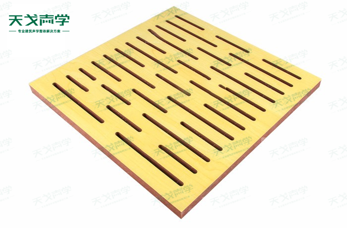 天戈U型孔孔木吸音板飾面顏色及材料選擇性廣,孔徑、孔距可根據客戶要求調整,能很好地滿足客戶多樣化的聲學及裝飾需求。孔木吸音板對吸聲頻譜選擇性較強,對中低頻有很好的吸聲性能。如在吸聲結構后空腔上填入適量的吸聲棉可提高中、高頻吸聲效果。