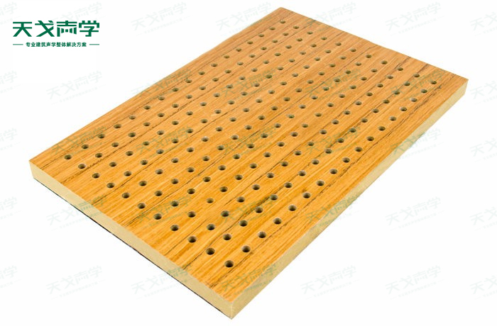 天戈禮堂孔木吸音板飾面顏色及材料選擇性廣,孔徑、孔距可根據(jù)客戶要求調(diào)整,能很好地滿足客戶多樣化的聲學(xué)及裝飾需求。孔木吸音板對吸聲頻譜選擇性較強(qiáng),對中低頻有很好的吸聲性能。如在吸聲結(jié)構(gòu)后空腔上填入適量的吸聲棉可提高中、高頻吸聲效果。