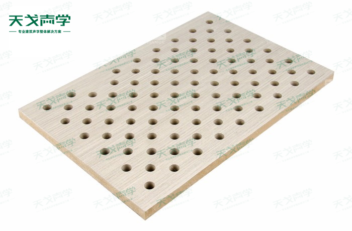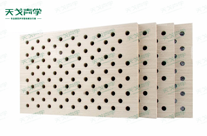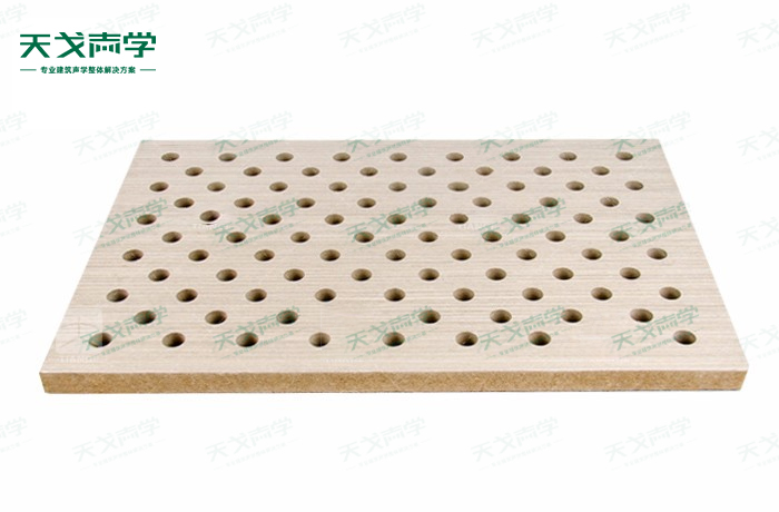 天戈會議室穿孔木質吸音板飾面顏色及材料選擇性廣,孔徑、孔距可根據客戶要求調整,能很好地滿足客戶多樣化的聲學及裝飾需求。孔木吸音板對吸聲頻譜選擇性較強,對中低頻有很好的吸聲性能。如在吸聲結構后空腔上填入適量的吸聲棉可提高中、高頻吸聲效果。