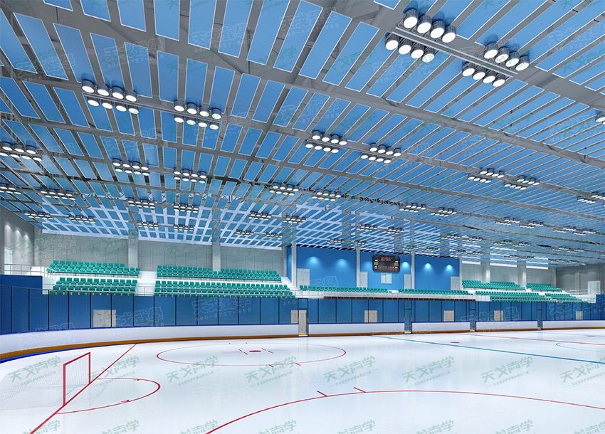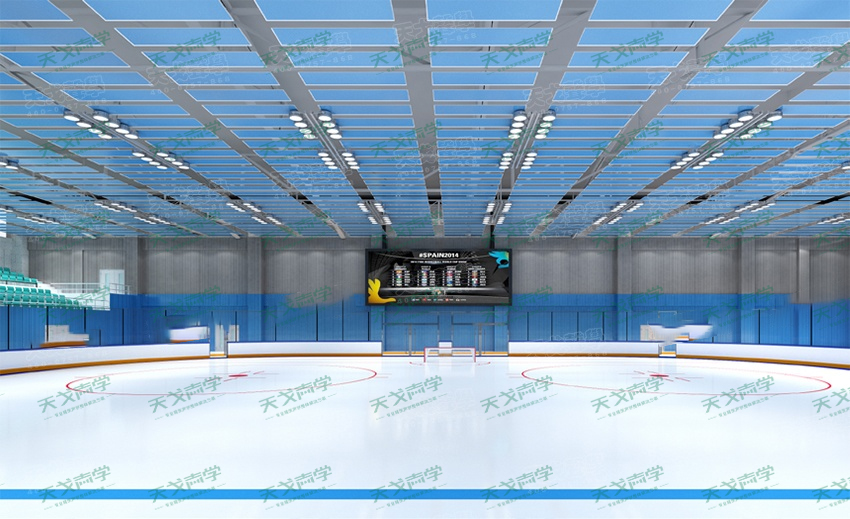 因冰球館內(nèi)存在顫動回聲、聲聚焦和回聲等聲學(xué)缺陷,需要對聲學(xué)材料進行合理布置,以達(dá)到消除各種聲學(xué)缺陷。為使該冰球館內(nèi)混響時間能達(dá)到合理水平,我們天戈聲學(xué)對該冰球館提出了相應(yīng)建筑聲學(xué)設(shè)計方案,最終使該體育館獲得了良好的音質(zhì)效果。我們選擇在冰球館墻面安裝藍(lán)色槽鋁吸音板,可以消除比賽池的顫動回聲。天花同樣懸掛藍(lán)色空間吸聲體,以便有效地降低了館內(nèi)的混響時間,同時大幅削弱頂棚聲反射能力,消除了頂棚多重回聲問題。