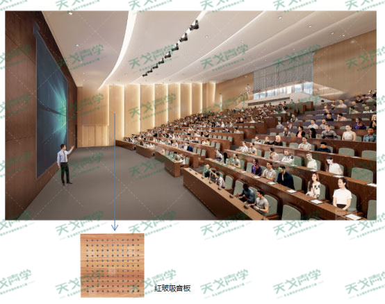 為了使階梯教室具有適宜的響度及語言清晰度,在兩側墻面、觀眾后墻面吸音板處采用紅玻吸音板,內填50厚32K吸聲棉包,安裝空氣層不少于100mm,背景墻面及其他部位均安裝木飾面。