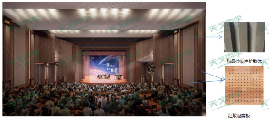 根據報告廳的裝飾效果,為了使報告廳具有適宜的響度及語言清晰度,在兩側墻面木紋吸音板處采用紅玻吸音板,內填50厚32K吸聲棉包,安裝空氣層不少于100mm,其他部位均安裝木飾面。