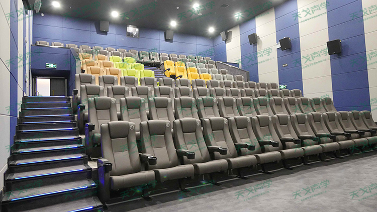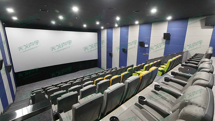 電影院觀眾廳的混響時間,不論何種類型的影院原則上都應采用強吸聲短混響和平直的混響頻率特性,以此,使電影錄音的還音真實。但考慮到單聲道普通影院與多聲道立體聲影院各自對混響的不同需求,以及觀眾廳容積的差別。因而混響時間應隨容積有不同的標準。考慮到控制低頻混響時間的實際困難,通常允許有一定的提升(相對于中頻500~1000Hz);而高頻混響時間,由于空氣中的聲吸收,以及觀眾和吸聲材料對高頻的過強吸收,而偏低的實際情況。