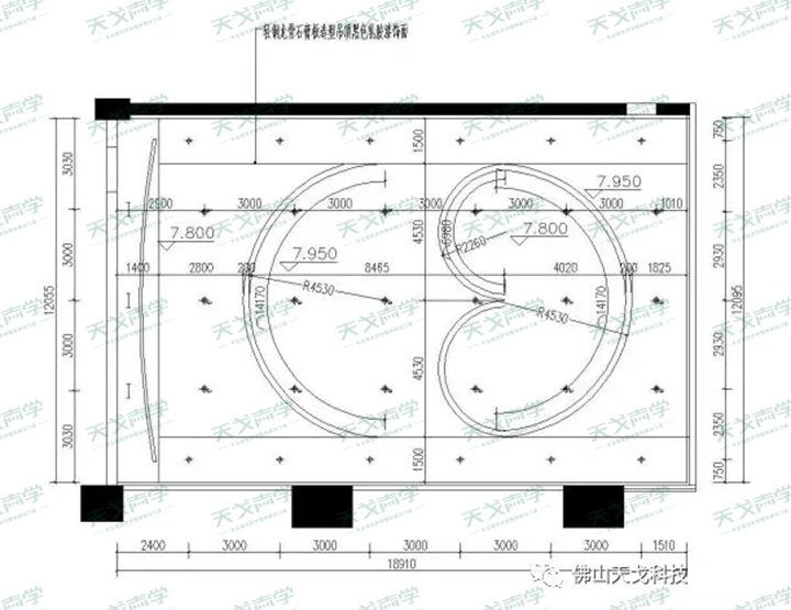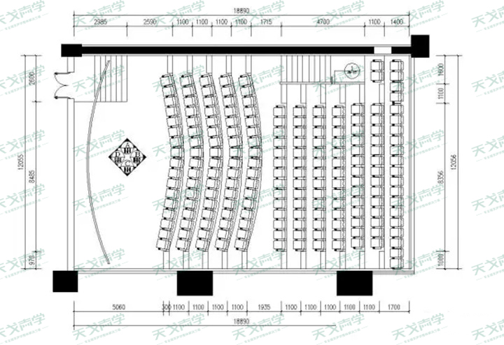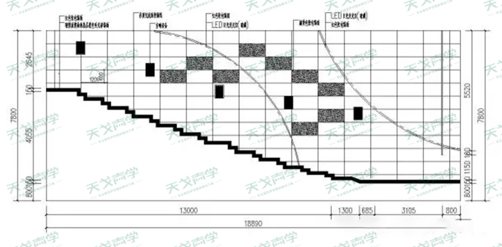 2、該場館長、寬尺寸較大,產生回聲明顯。將嚴重干擾前排座位的聽覺效果。因此必須要進行專業的聲學處理。