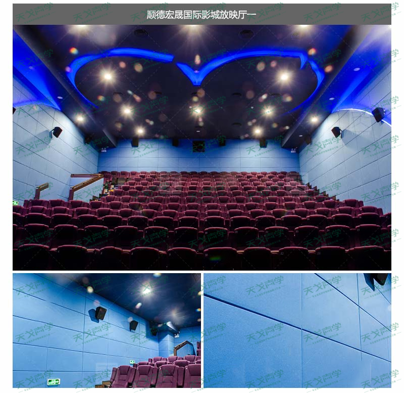 經研究決定,該影城采用了天戈聲學生產的軟包吸音板2000多平方米,利用軟包吸聲材料消除觀眾廳聲聚焦、顫動回聲、多重回聲等聲學缺陷;減少了噪聲對擴聲系統的聲干擾,營造了一個良好的視聽效果。項目完工后得到客戶的一致認可與好評!