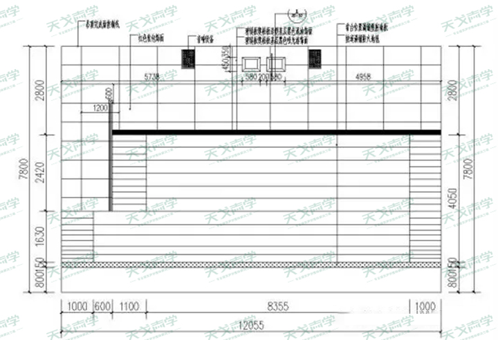 根據專業軟件計算及綜合到墻面,地面材料的墻面,天花不必采用強吸音材料,因此考慮成本問題,建議天花進行石膏板造型裝飾處理。